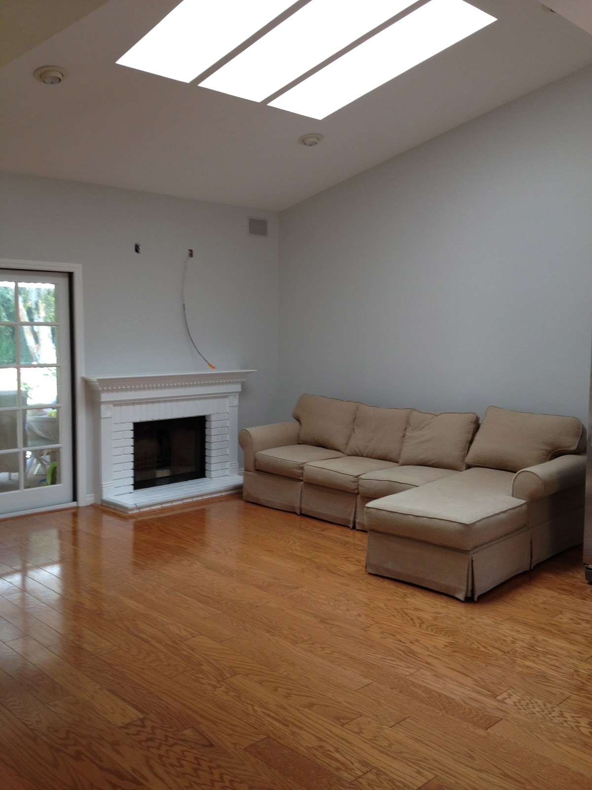 Thankfully we had saved unexpectedly in a couple aspects of the job so far, so there was money available to allocate to ridiculous shipping costs for extra wood. So much for doing our homework. To fuel the fires of our stress even more, the flooring that showed up was darker than the existing flooring because of a little thing called the sun, which had faded our floors over time. Big sigh. After a lot of strategic drawings last night, we managed to carve out a plan to integrate the new wood without there being a strong line of demarkation. It's not the greatest picture, but I think they did a pretty good job making it look like we did it on purpose. See for yourself.
